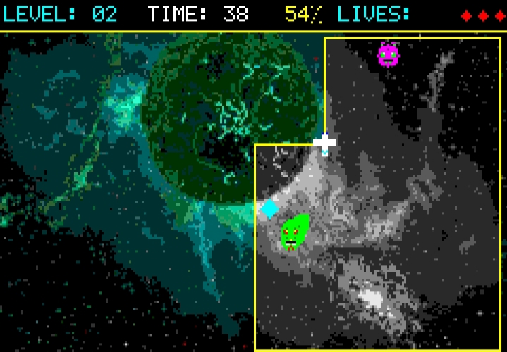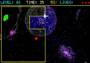You control a ship navigating the safe perimeter of the playing field. To claim territory, you must venture out into the open area. By tracing lines and reconnecting back to a safe edge or previously captured land, you enclose that section, turning it solid and adding to your victory percentage.